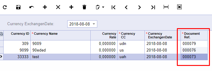 public class CurrencyMaint : PXGraph<CurrencyMaint, UsrCurrency> { public PXFilter<ExchangeDateFilter> Filter; public PXSelect<UsrCurrency, Where<UsrCurrency.currencyExchangeDate, Equal<Current<ExchangeDateFilter.exchangeDate>>>> Currencies; public PXSetup<Setup> AutoNumSetup; public CurrencyMaint() { Setup setup = AutoNumSetup.Current; } protected virtual void UsrCurrency_RowPersisting(PXCache sender, PXRowPersistingEventArgs e) { UsrCurrency doc = (UsrCurrency)e.Row; if (sender.GetStatus(doc) == PXEntryStatus.Inserted) { AutoNumberAttribute.SetLastNumberField<UsrCurrency.extRefNbr>( sender, doc, typeof(Setup.returnLastDocNbr)); } } }