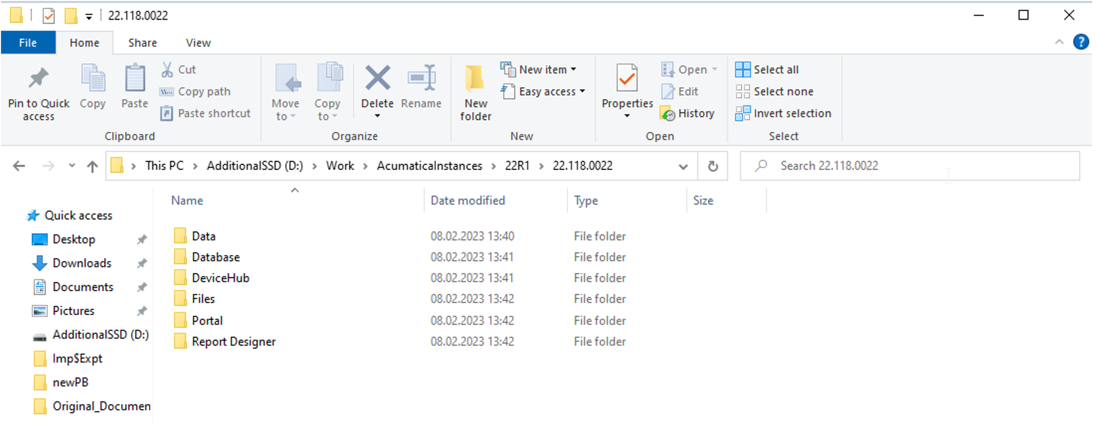 Now, whenever you need build 22.118.0022, it is already installed and does not require reinstallation. All you need to do is navigate to the folder using the given path and run the AcumaticaConfig.exe file, and all your instances will be located in the root of the 22.118.0022 folder by default.