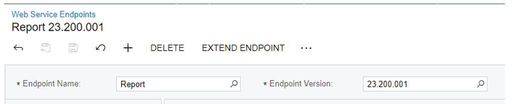 We start of creating an endpoint for reports. For this we navigate to the Web Service Endpoints (SM207060) screen. In this article we will create a new endpoint, but it also works with extended endpoints.