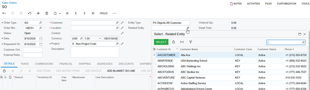 You will see that when selecting the document type "SO," our “EntityType” field is set to Customer, and the “RelatedEntity” selector will display all customers.