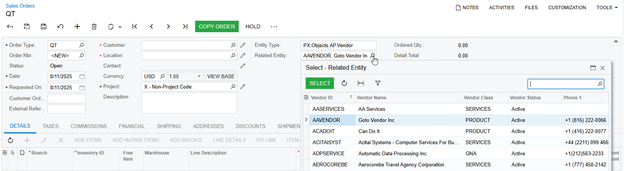 ut if you change the type, for example to "QT," the “EntityType” field changes to Vendor, and the “RelatedEntity” selector will display all vendors.